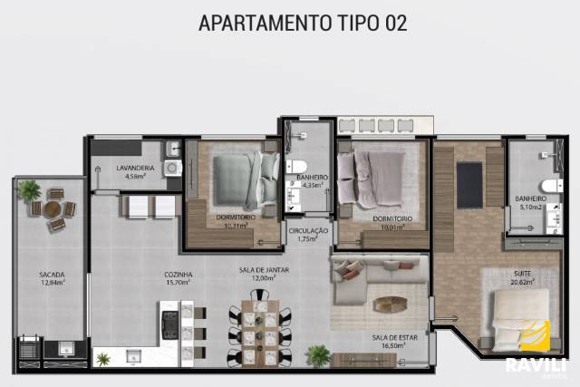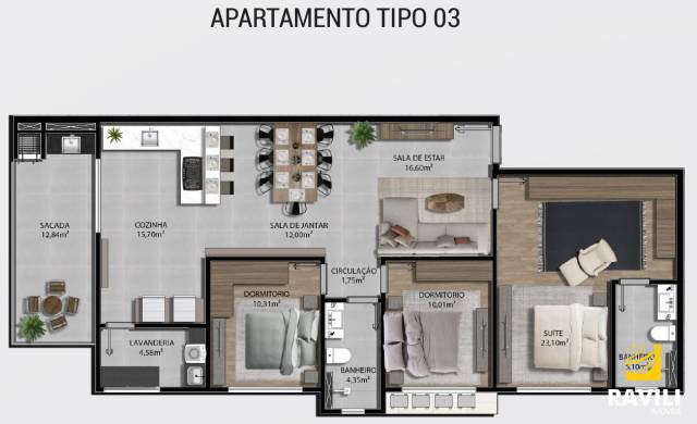 > Apartamentos com 3 dormitórios sendo 1 deles suíte;